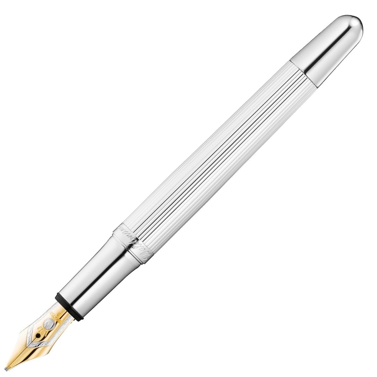 Die silberne Farbe, ergänzt durch platinierte Zierelemente, ausgestattet mit einer 18 Karat Goldfeder: Das ist der Waldmann Pocket Füller!