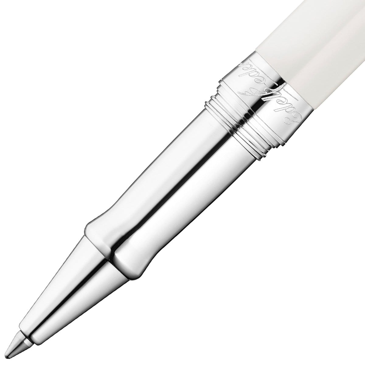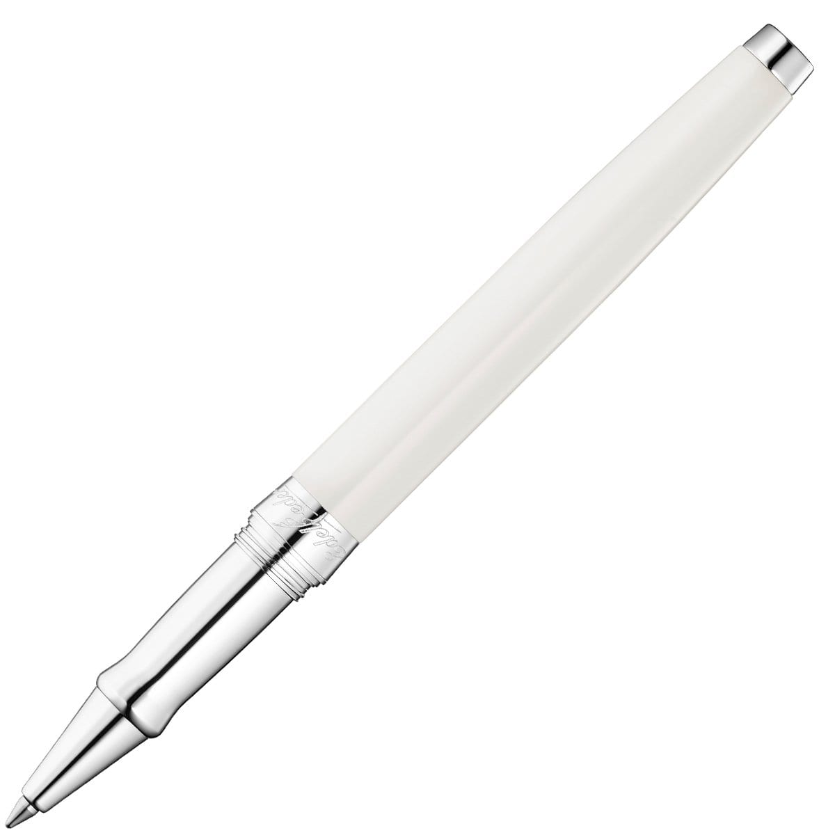 Der Waldmann Edelfeder Rollerball in weiß wird mit platinierten Zierelementen vervollständigt und hat ein Modern Classic Design.